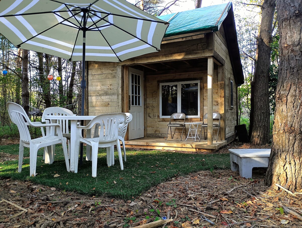 🏠off grid cabin on private, quiet lot 🛏️two twin size beds with waterproof, sanitized encasement 🔥fire pit with cooking grate and basic cooking supplies 🍽️covered picnic area for outdoor dining 🚽brand new porta john 🎯horseshoe pit and yard games for outdoor fun 🎲indoor games for cozy cabin time 🚶♀️short walk to Shay Lake (host coordinated access) 🏘️second cabin ("Josephine") for group camping (ask host)