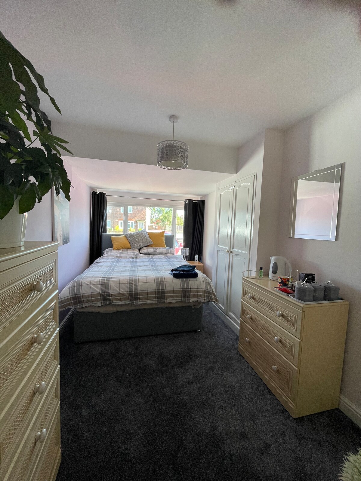 This is a large spacious bedroom with an ensuite Bathroom fitted with a large shower. Inside you have a king size bed, sofa SmartTV so you can connect to your Netflix account. (WI-FI details are provided . As well as a kettle for tea or coffee free snacks & water bottles. The room includes two robes, slippers, an electric radiator, a steamer for your clothes, extra blanket , toiletries,fridge for cold & warm food. We really hope you enjoy your stay! Any questions please feel free to message.