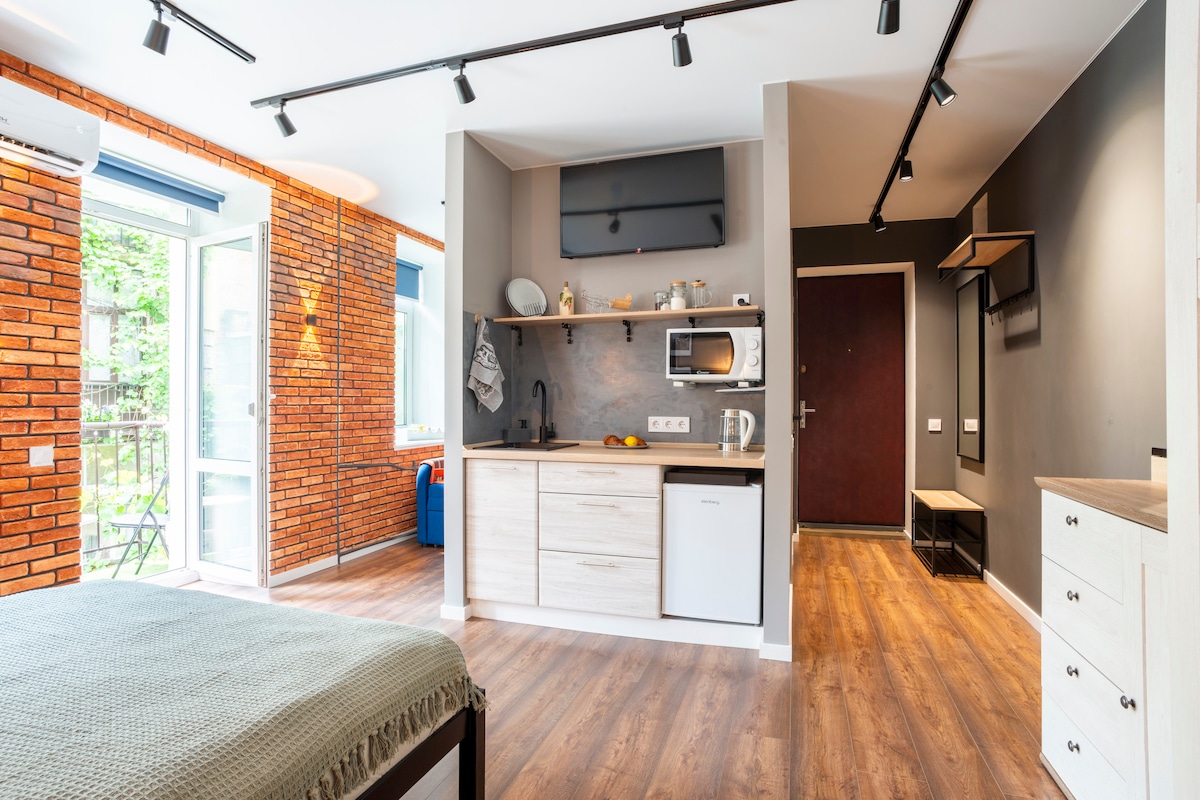 We are pleased to present you a beautiful hotel-type studio in a historic building, which was built in 1905 year, located in the historic centre of the city and it is in the list of architectural monuments. We offer our guests a vacation in new, after renovation, apartments with high ceilings and a quiet courtyard. Well-designed living room with a large bed, an equipped mini compact kittchen. The design is created for your comfort and quality. 43 "ELED-Smart TV with cable TV, internet, WIFI
