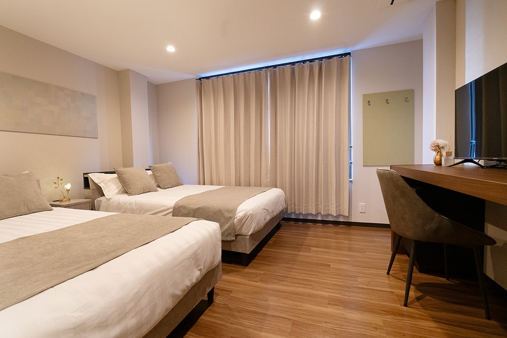 R Hotel Namba 是一家新建的飯店,距離難波站僅 10 分鐘的步行距離。 配備共用廚房、投幣式洗衣房等設備,可根據生活方式使用。 客房設計融合了日式現代風格,提供 3 種房型:雙人房、雙床房和豪華房, 從單人到團體使用,滿足各種需求。 一樓設有共用休息室,為遠距工作人士和商務人士提供最理想的空間。 部分客房也可作為月租公寓,強調舒適的居住空間。