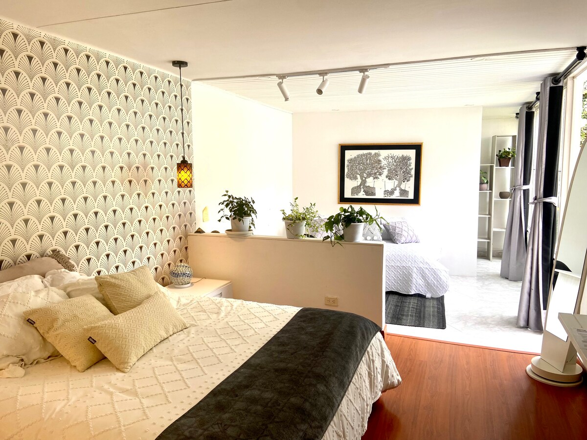Cómodo y acogedor loft central en Bogotá con fácil acceso al transporte público y lugares turísticos. Cuenta con cocina bien dotada, cama doble cómoda, escritorio y artículos de aseo personal en el baño. Tiene una terraza privada única en la zona con vista al atardecer, además de una chimenea para disfrutar al aire libre. Ideal para quienes buscan una buena ubicación central cerca de la vida nocturna y los mejores restaurantes. Si deseas tener información más completa lee el texto a continuación