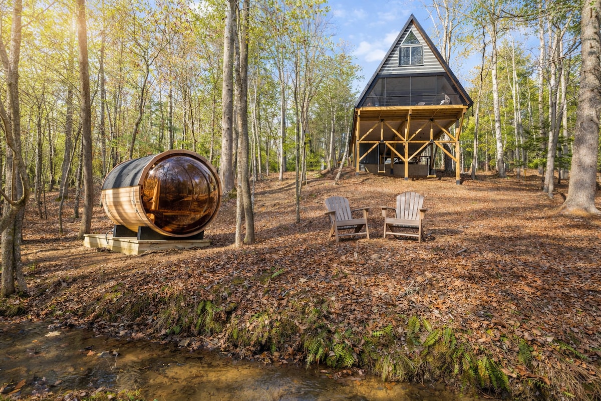 Reece Retreats邀請您前往Whisper Creek Retreat,這是一棟豪華的A型樹屋,建於2025年,靠近佐治亞州藍嶺。 這間2BR/2BA小屋位於私人溪畔,可容納6人,設有篩選陽台、桑拿房、熱水浴缸、火坑、室外電視休息室和遊樂場。 享受落地窗、設備齊全的廚房、高速WiFi和完全的寧靜。