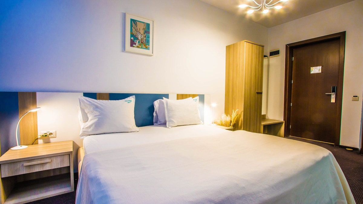 Cameră modernă și primitoare în inima Bucureștiului, perfectă pentru relaxare după o zi de explorat orașul. Pat queen confortabil, design fresh, Wi-Fi rapid, AC și baie privată. Aproape de transport, restaurante și viața vibrantă a capitalei. Alegerea ideală pentru o escapadă urbană fără griji!