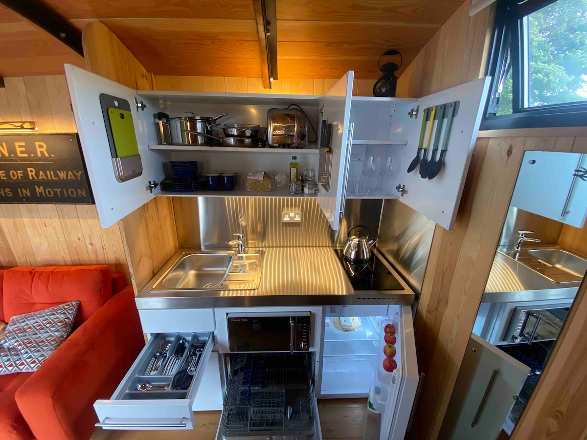 Relax in total comfort, in our converted 1950s railway goods van. Once common place on farms around the Peak District this little gem is far removed from the animal shelter it once was! Fitted out to the highest quality, featuring a king sized bed, comfy sofa, kitchen, log burner and smart TV, etc. Something quite special, situated in its own secluded area, a few steps away from the magnificent views of Chrome hill and the Dove valley beyond.