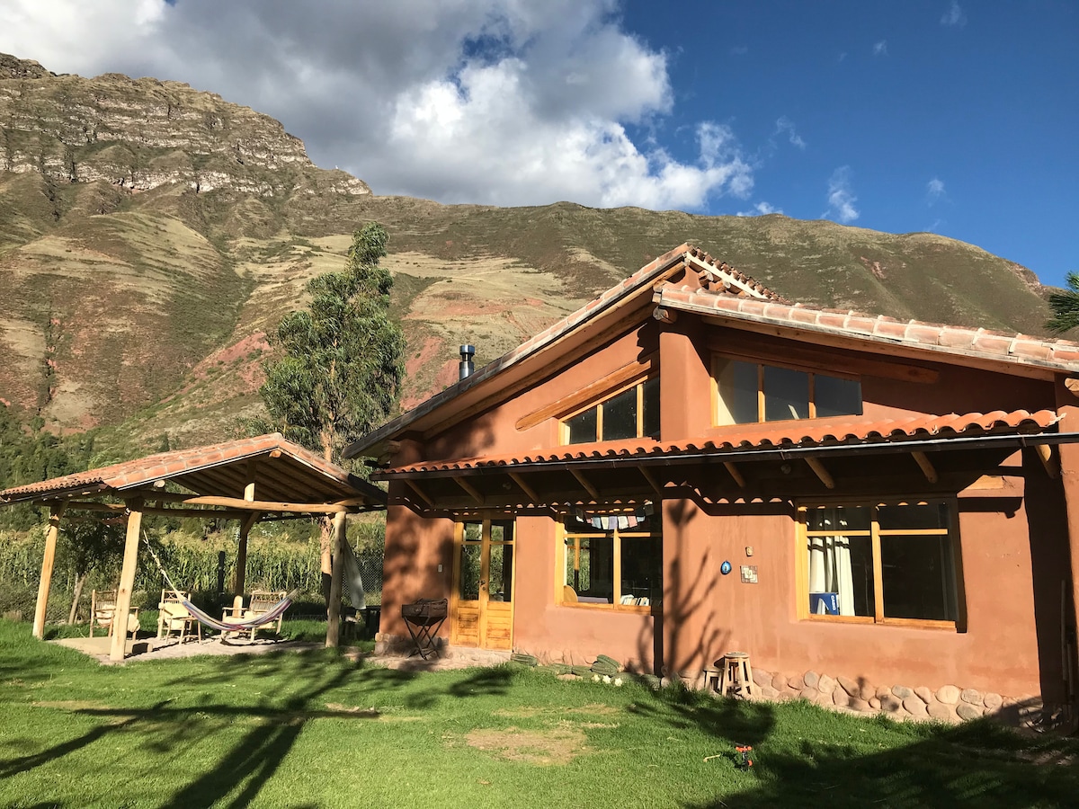 La mejor vista de todo el Valle Sagrado hacia los glaciares Andinos! Si deseas paz, tranquilidad y descansar lejos del bullicio del Valle Sagrado pero al mismo tiempo poder visitar todos los atractivos de la zona, esta casa es tu paraíso. Nuestra casa está 100% ecológica, muy bien ubicada a pocos minutos de Maras y Urubamba y en un sitio muy tranquilo para disfrutar de la naturaleza. La casa recolecta el agua de la lluvia y se mantiene caliente de forma natural. Está construida naturalmente.