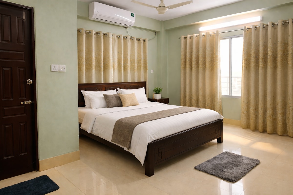 在Bashundhara的這間時尚公寓的獨立住宿。 預訂1個房間,可供1至2人入住 2 間房間可供 3 至 4 人入住,3 間房間可供 5 至 6 人入住 所有臥室均設有雙人床。 無論您預訂1間房間還是2間客房,都不共用。 Bashundhara的中心位置靠近機場、Baridhara和Gulshan的大使館。 靠近Evercare醫院和國際修道院中心Iccb。 僅適用於家庭或商務差旅人士。 不接受未婚夫妻。 禁止舉辦派對,但歡迎家庭聚會。