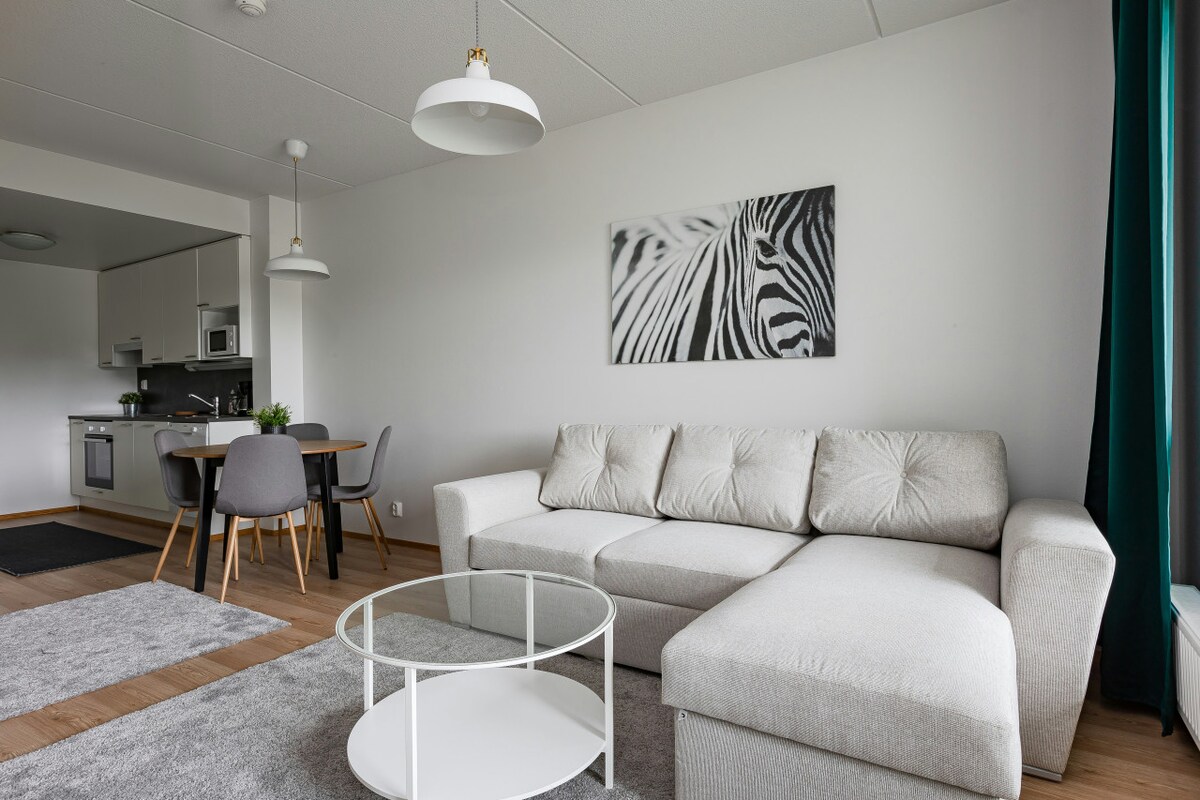 這間現代化舒適的單間公寓適合兩人或有兩個孩子的家庭入住。 舒適優質的牀鋪保證雙人睡個好覺,而客廳的沙發牀非常適合家庭中的小孩入住。 房間配有平板電視、電水壺、咖啡機、烤麵包機和吹風機。 設備齊全的廚房配有烹飪設備、冰箱、微波爐、洗碗機和綜合爐具,可供您準備所有最喜愛的菜餚。