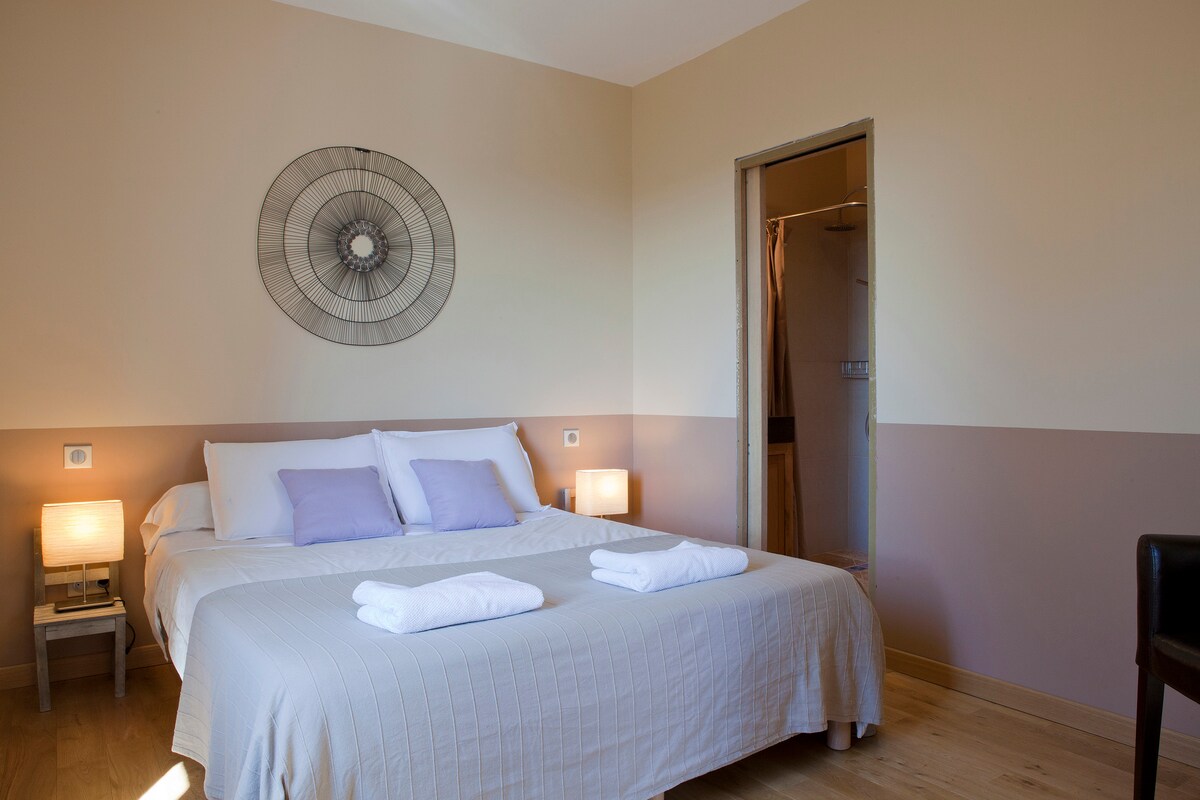 舒適的單間公寓,可供2人入住:Bultex床、書桌區、獨立通道、不被忽視、網路、冷氣、平原的迷人景觀。 您將使用:住宿設備齊全的廚房、花園內4月至10月開放的共用泳池。 提供床單/毛巾 場地有私人停車位 可自助入住密碼鑰匙盒。 距離尼姆和蒙彼利埃35分鐘