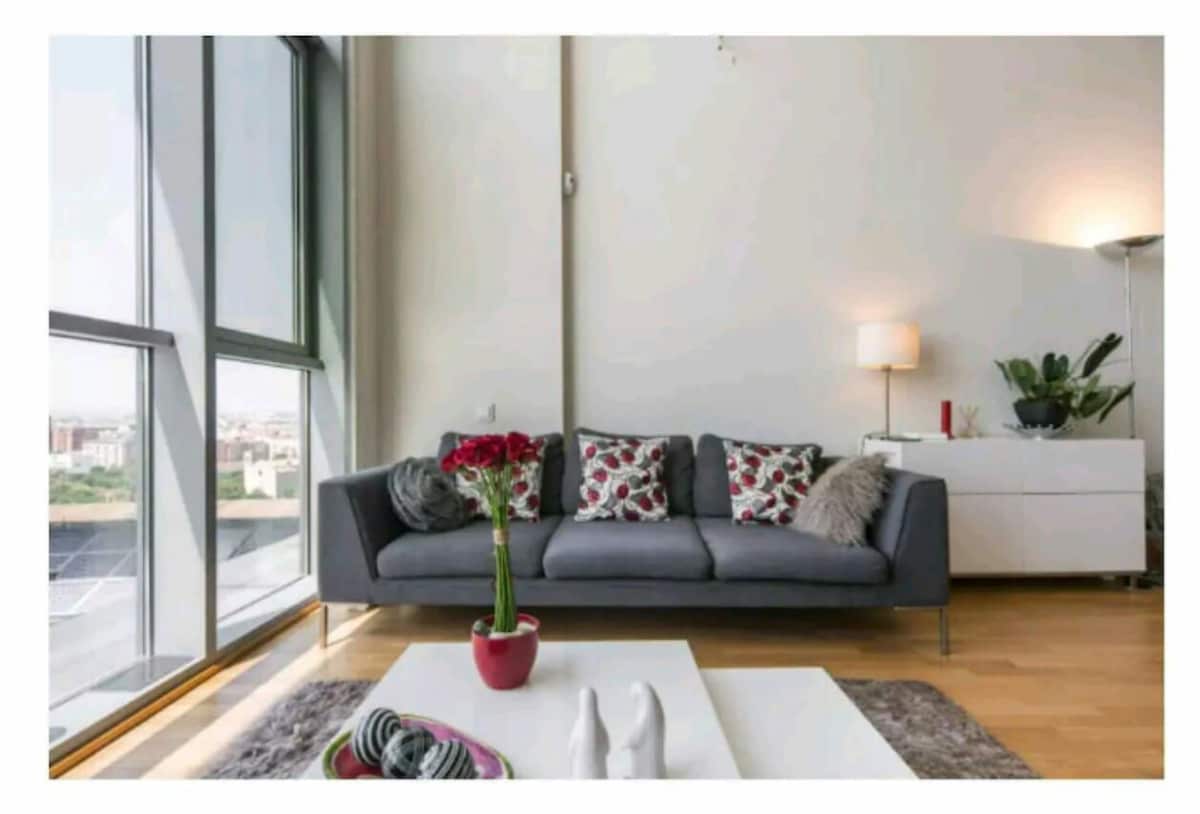 16樓的複式公寓,擁有絕佳的全景視野,並且比飯店更高級。完全隔音,是您安靜休息的理想選擇。 獨特且獨立的空間,非常適合情侶入住 毗鄰ARENA購物中心,附近有商店和餐廳。 免費私人停車場,可搭乘電梯直達閣樓。 步行 2 分鐘即可抵達地鐵站和超市。開車 5 分鐘即可抵達海灘。 僅限情侶使用:不允許兒童或訪客入住。 WiFi + 65 吋電視和全套廚房。