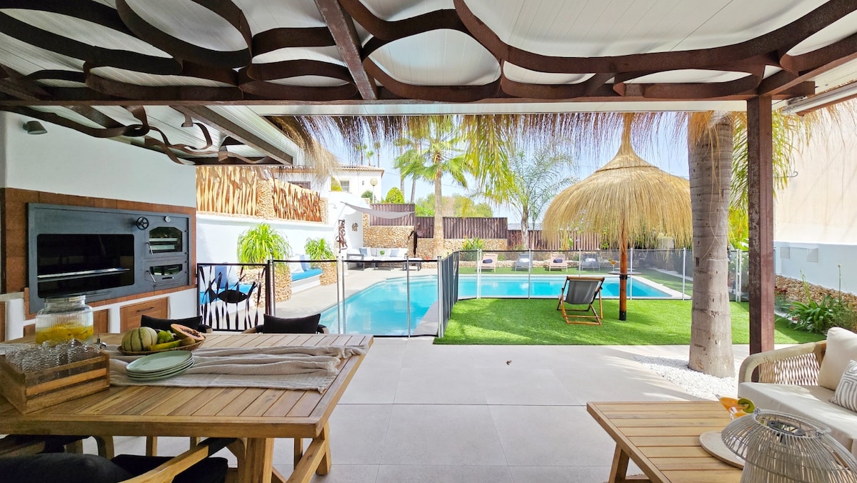 En este alojamiento se respira tranquilidad: ¡relájate con toda la familia! Chalet independiente privado. Totalmente nuevo, esta casa está pensada y diseñada para el mejor confort y con todos los detalles de primera calidad, muy bien decorado con terraza cubierta, cocina exterior,barbacoa,piscina con jacuzzi y parking privado. A 2 minutos un parque para niños y a 15 minutos andando de supermercados y playas. Muy cerca de las mejores calas de Jávea,restaurantes y rutas de senderismo