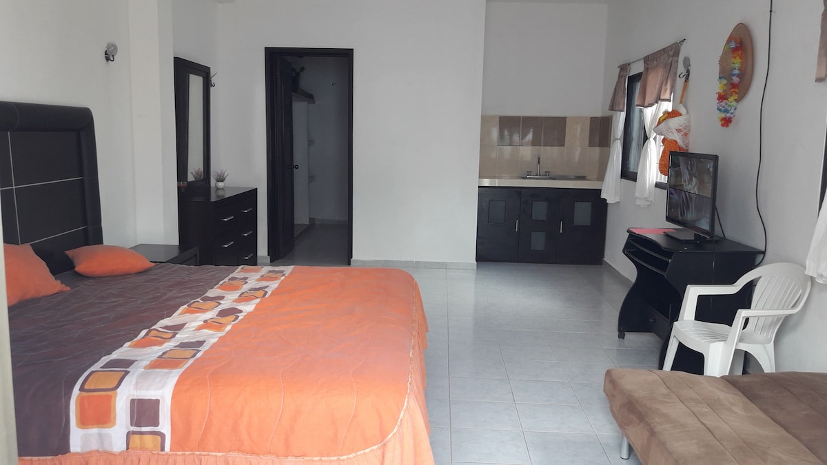 Ambiente acogedor moderno reconfortante , área de alberca, barra, medio baño, regadera externa. recámara y baño amplios