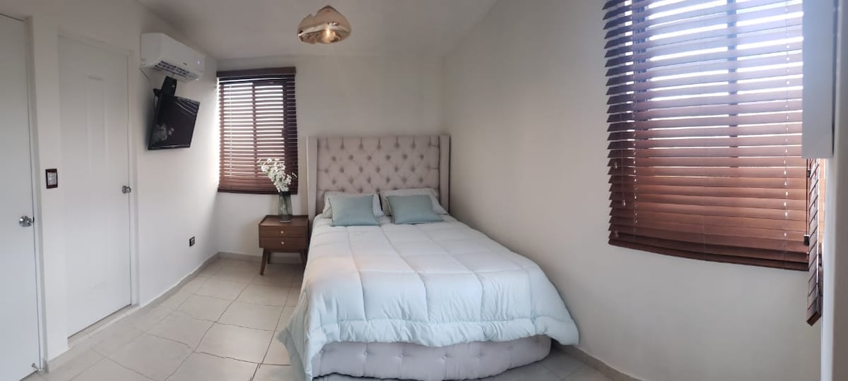 享受一個非常靠近機場的地方,整套房子有兩間臥室和您工作或家庭旅行所需的一切。 位於一個受控的殖民地內,設有公園、綠地、球場和兒童遊戲。 非常靠近主要大道和商店Como Soriana、Oxxo。