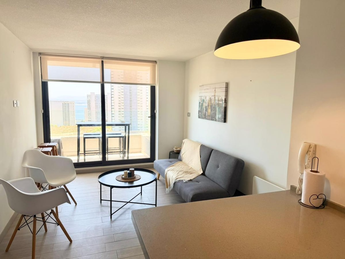 Disfruta de este alojamiento tranquilo y céntrico en el sector de Costa de Montemar, a pasos de restaurantes, supermercados, espacios para caminar y disfrutar de la naturaleza, cerca a la playa y dunas. Podrás disfrutar de la piscina en verano, y del parque en tus paseos por el sector. Consta de: - 2 habitaciones -1 baño - Living comedor - Piscina - Cocina totalmente equipada - Terraza con espectacular vista - Wifi - Tv - Gym - Lavanderia - cafetera