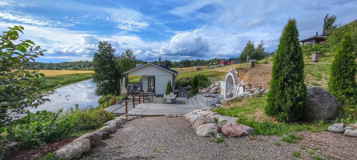 Modern house by the river, stunning views, swimming opportunities in the summer and a large sauna area and terrace. If you wish, you can take a dip in the warm whirlpools under the open sky. High-quality package! You can enjoy the jacuzzi baths for an additional price of 100€/1st night, subsequent nights 50€/night. The jacuzzi must be booked in advance and paid upon arrival. There is a corner sofa in the living room that conveniently converts into a double bed. No extra guests.