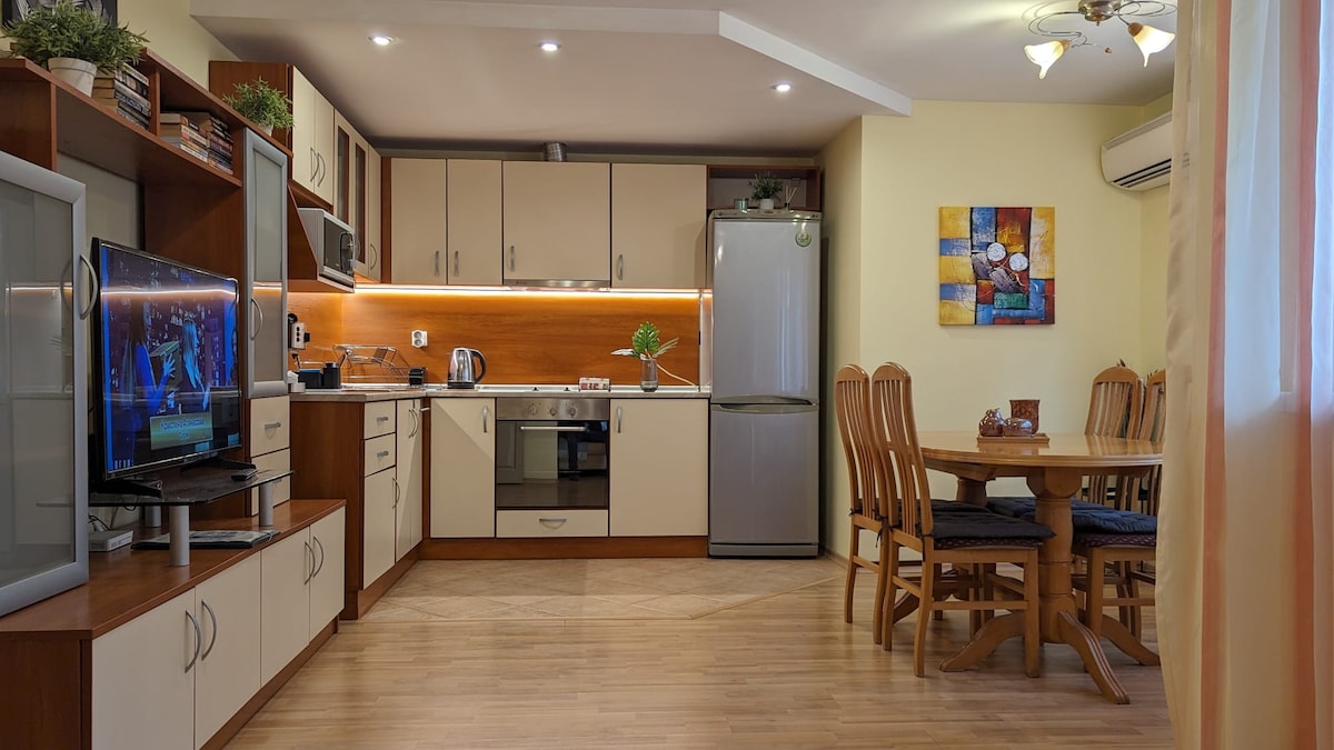 The 45 sq.m. apartment, small, but real "jewel"- inside you can find everything you need for a full stay and carefree vacation. It is located on the second floor of a building from the 60s, without an elevator. Modernly furnished with attention to detail. It's location allows you to be minutes from all the entertainment, the beach ⛱️, night life 🍸 of Varna, at the same time you are only 10 minutes walk from the center and the pedestrian zone.