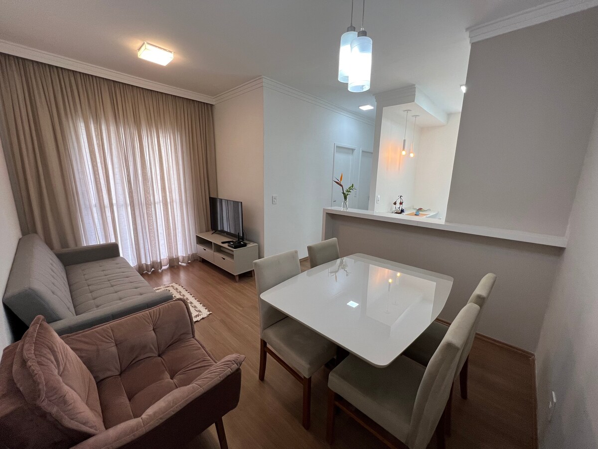公寓位於封閉式公寓內,設有門衛和24小時監控攝影機。 公寓設施完善,適合休閒或工作。公寓內有便利商店,可購買小商品。 靠近加油站、市場和麵包店。 前往 Hopi Hari、Wet'n Wild 水上樂園很方便。距離安漢格拉高速公路、班代蘭特斯和市中心不到10分鐘! 公寓最多可容納 5 位房客(4 張床和 1 張沙發床)。 公寓位於一樓,有樓梯。