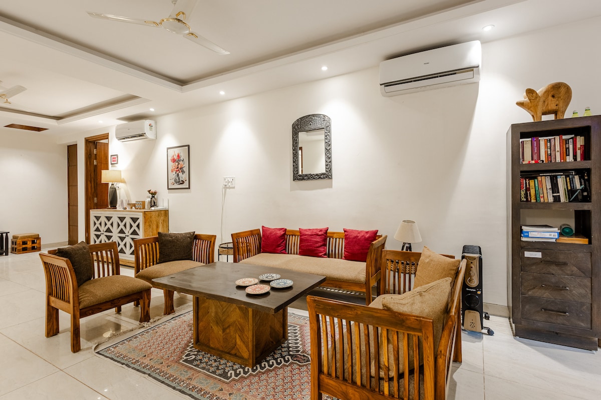 Welcome to Golfgreens: a luxurious, sun-lit 3500 sq ft, 4-bedroom, ground-floor apartment in Saket, South Delhi. Located 3 minutes from Malviya Nagar Metro, PVR Anupam & Select City, DLF Avenue Malls. 4 en-suite bedrooms featuring king-size beds, attached bathrooms, air-conditioning, heaters, air purifiers, smart TVs, and premium linen. Relax in the spacious living room, a fully equipped kitchen with indoor and outdoor dining, and a private garden. Your oasis in the city awaits.
