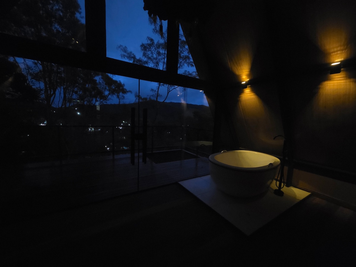 想像一下,你抵達山上一間迷人的小木屋,四周綠意盎然,靜謐的環境中有著令人驚豔的景色。 在這裡,時間會慢下來。 木材的香氣、壁爐的溫暖和日落時加熱的按摩浴缸,為兩人創造獨特時刻的完美環境。