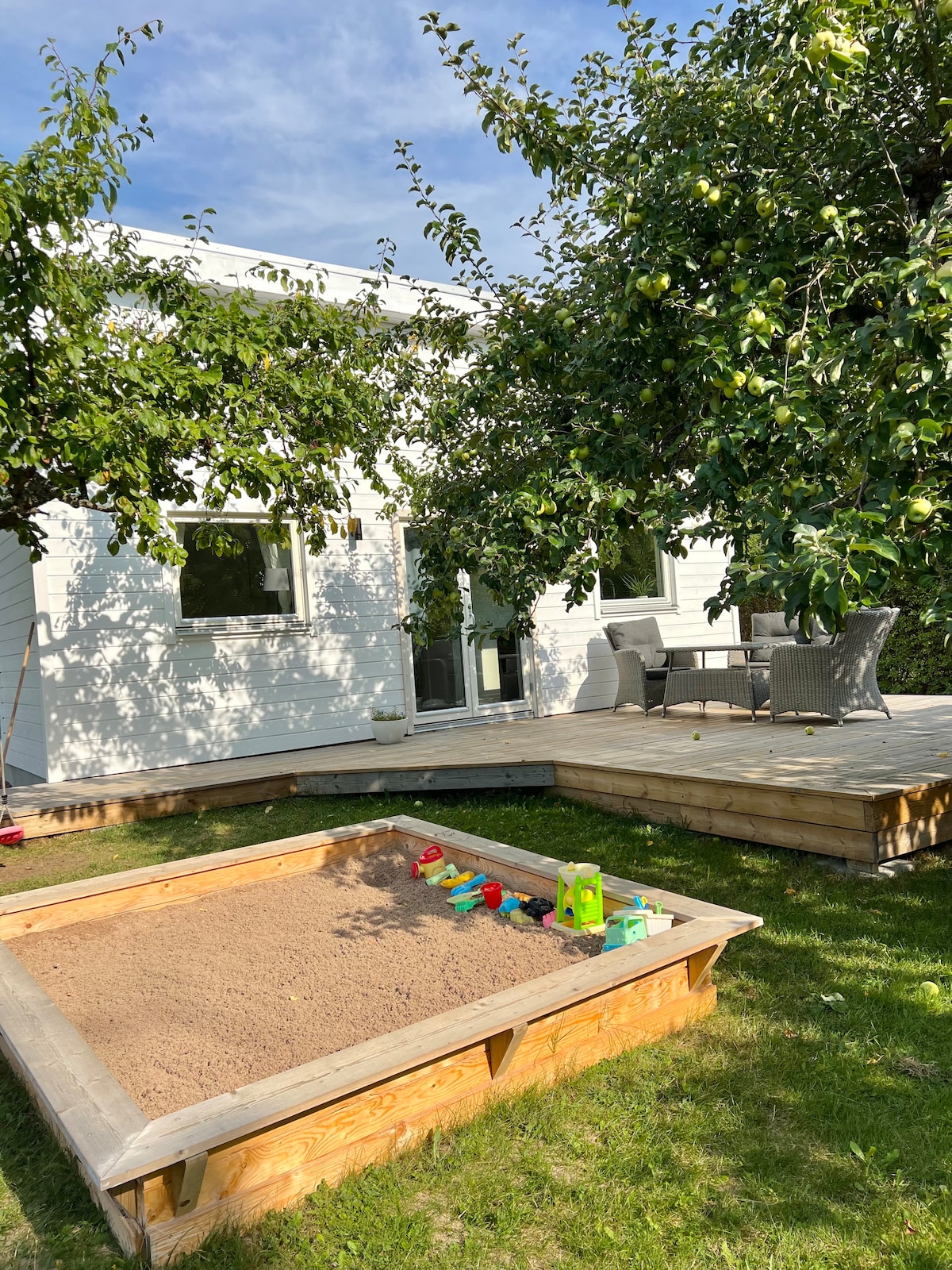 位於市中心的房子, 25平方公尺,配有120公分的臥室閣樓,可移動梯子到達。 免費停車。 空調。 客廳寬沙發牀「舒適」149公分寬。 可借用兒童嬰兒牀/高腳椅。 推薦3-4人入住。 設備齊全的廚房,提供免費咖啡和茶。 馬桶、淋浴、免費衛生紙、香皁和洗碗皁。 配備cromecast的智慧電視。 組合式微波爐/普通烤箱。 帶上牀單和毛巾,費用為每人100瑞典克朗。 配有休息室家具的私人露臺。提供燒烤。 無鑰匙前門的密碼鎖定。