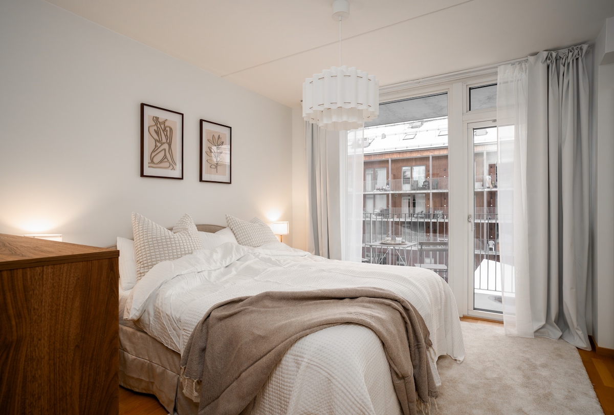 Min moderna lägenheten har plats för upp till tre gäster. Njut av den stora balkongen med en mysig soffgrupp och fin utsikt över naturen. Området är lugnt och familjevänligt med skog och park i närheten för promenader och cykelturer. Lägenheten har TV med Netflix, HBO och Amazon Prime, samt diskmaskin och tvättmaskin. Du har även egen parkering. Nära finns flera restauranger, inklusive medelhavsrestaurang, pizzeria, Burger King och asiatisk restaurang. Jag ser fram emot att välkomna dig!