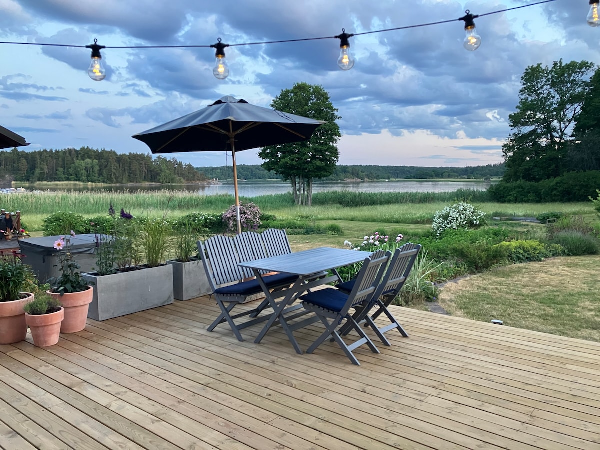 安靜的新建房屋,面積為240平方公尺,可欣賞美麗的海景,並裝飾得非常舒適和閒逛。 大客廳、廚房和餐廳合一(約90平方公尺) ,另外兩間客廳(一間配有電視,一間工藝室)。 四間臥室,其中一間也是辦公室。三間浴室。 大露臺,有許多座位區域和熱水浴缸。 後面的藍莓稻田和森林,前面有美麗的海景。 距離遊泳150公尺,距離遊戲/遊泳區域500公尺,距離Vaxholm 15公裏,距離斯德哥爾摩市中心30公裏。