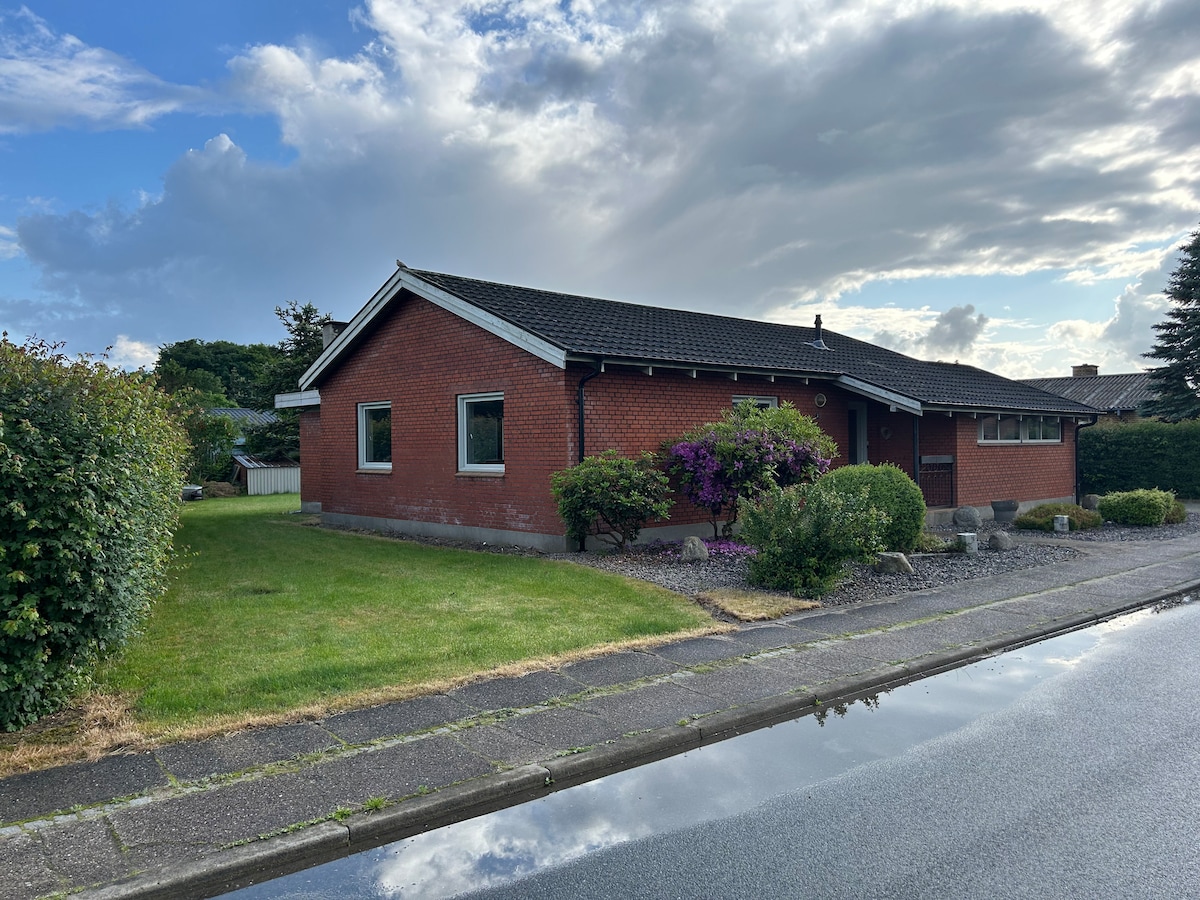 帶全家人入住這間迷人的房子,有足夠的空間讓您玩得開心。 我們的房子位於安靜的住宅街道上,靠近購物、運動和大自然+靠近Givskud動物園( 8公裏)和樂高樂園( 25公裏)。 房子裡有三個房間,大廚房,配有燃木爐的大客廳和一間浴室。 後走廊有洗衣機、烘乾機和衣櫃冷凍庫。 花園內有一個大型有蓋露臺,配有燒烤、室外淋浴間、蹦牀、遊戲室、搖擺架、火坑和舒適的避難所。