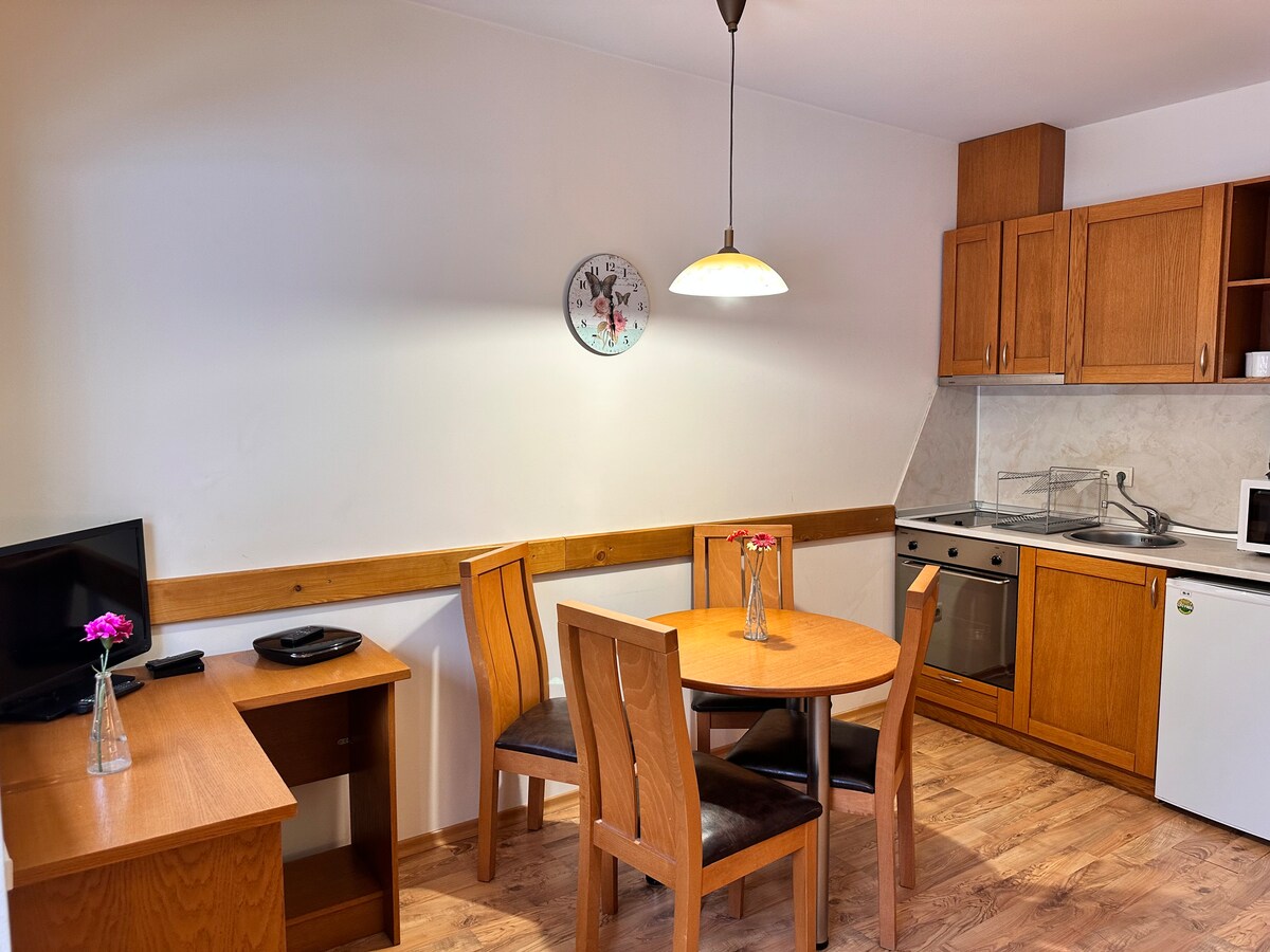 在漫長的滑雪或徒步旅行之後,歡迎來到我們在Borovets的「放鬆」單間公寓。我們很樂意接待您,並引導您參觀保加利亞最古老、最美麗的山區度假村。 我們舒適的單間公寓可容納4位成人(一張雙人床和一張沙發床)。房源有一間帶淋浴間和馬桶的浴室,以及一個帶水壺、微波爐和烤麵包機的小廚房。 步行即可抵達許多餐廳和小型市場。
