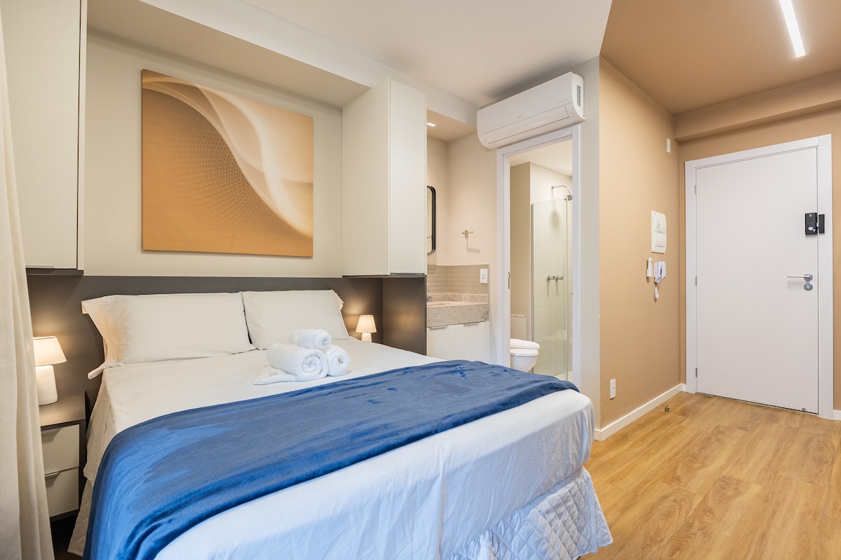 Estúdio moderno e ensolarado com cama queen size