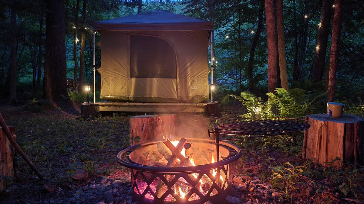 Enjoy the lovely setting of this romantic spot in nature. Sugar Brook Glamping provides the excitement of outdoor camping with the comforts to add absolute perfection to your camping experience. This oversized platform with canvas tent includes a private grill, your own fire pit and best of all you are a 3 minute walk to Basecamp common lounge to enjoy all the amenities such as 2 fully equipped bathrooms with walk in showers. We provide towels, body wash. Full kitchen, WIFI and more!!