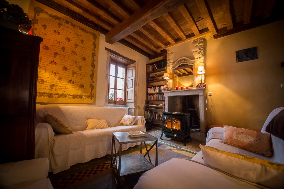 Cool, comfortable and spacious (90m2) home on 2 floors. Large kitchen , lounge and terrace on street level and fabulous 1 double bedroom open plan room on the 2nd floor. A converted grange perched on a mountain in a medieval village 16 minutes from the A6, this peaceful home makes an ideal stop over for holidays in the Alps or south of France. Please note - there is a studio apartment with its own entrance on the lower ground floor - rented separately.