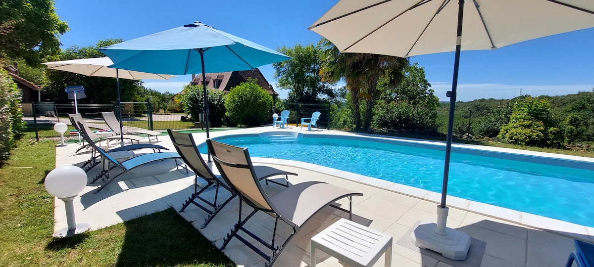 Welcome to our gorgeous country home nestled in rolling, forested hills. Enjoy an exceptional 180° view of the Dordogne while swimming in our infinity pool (open May to October only) or hot tub (available all year). Our property sits on 4 acres of tranquil countryside at the top of the verdant Dordogne valleys. Sit back, have a glass of wine, and watch the hot air balloons paint across the sky at sunrise or sunset. Use our bicycles to explore the locale or BBQ outside and take in the scenery.