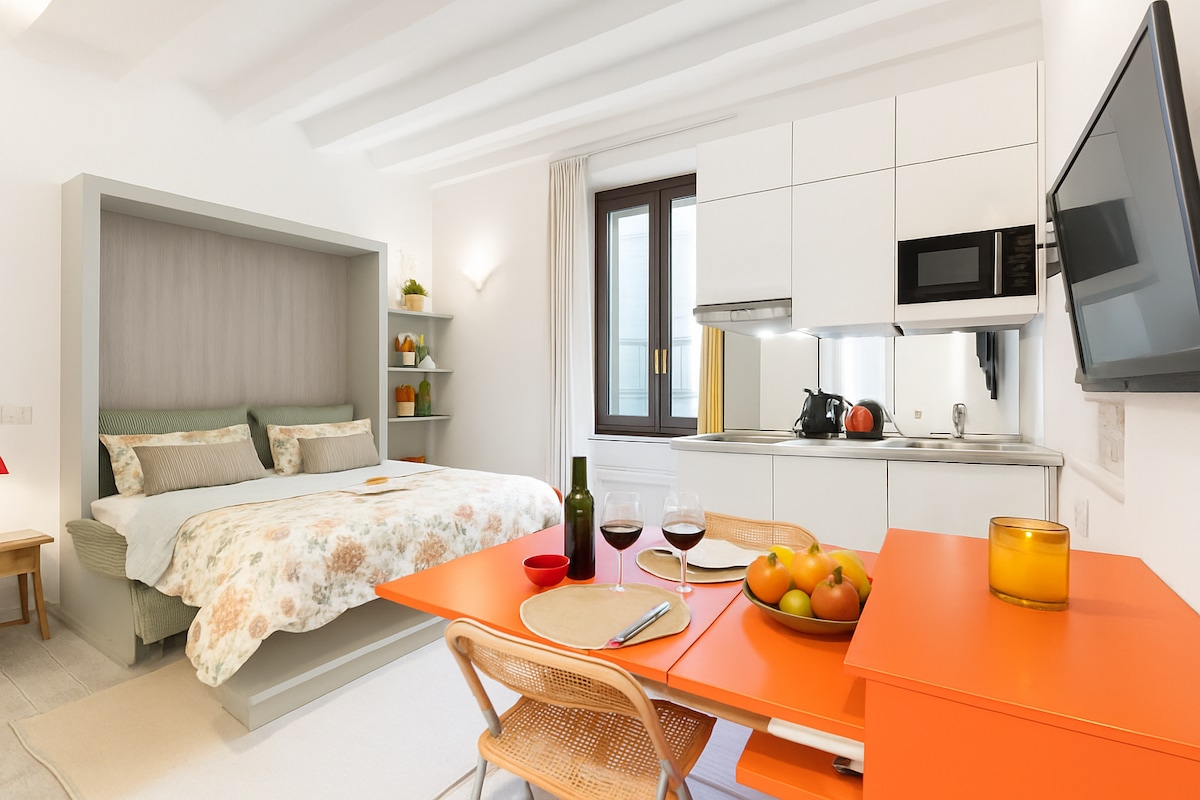 In the heart of the Navigli district, my 540 sq.ft. flat very meticulously renovated and decorated with the utmost attention to detail. Warm and comfortable, it's located at the beginning of the pedestrian area that leads to the Naviglio Grande. Characteristic, historical and world-famous neighborhood, it's dotted with restaurants, cafes, bars, interesting shops, art galleries...anything your heart desires. Well served by public transportation (metro & trams) as well as bike-sharing stations.
