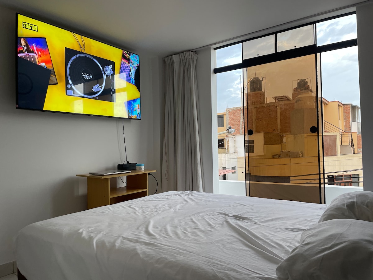 Refúgiate en un loft moderno y luminoso en la exclusiva urbanización California, Trujillo. Ubicado en un sexto piso de acceso por escaleras (sin ascensor), ofrece privacidad, una excelente vista y una tranquilidad difícil de encontrar en la ciudad. Zona céntrica, rodeada de parques, restaurantes y cafeterías. El depa cuenta con cama cómoda, cocina equipada, barra alta, TV, WiFi y lavadora. Ideal para escapadas o viajes con estilo.