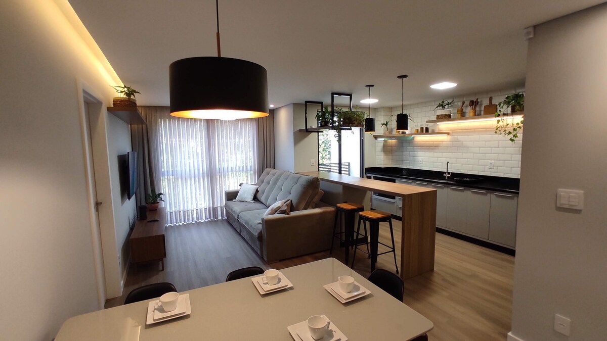 漂亮的閣樓,配備所有資源和設備,讓您感到舒適,裝飾精美,讓您的住宿難以忘懷。 步行5分鐘即可抵達德意志村(Vila Germânica),步行15分鐘即可抵達市中心,位置優越,靠近城市的主要景點,無需開車。 封閉式安全公寓,配有車庫、健身房和全景泳池。