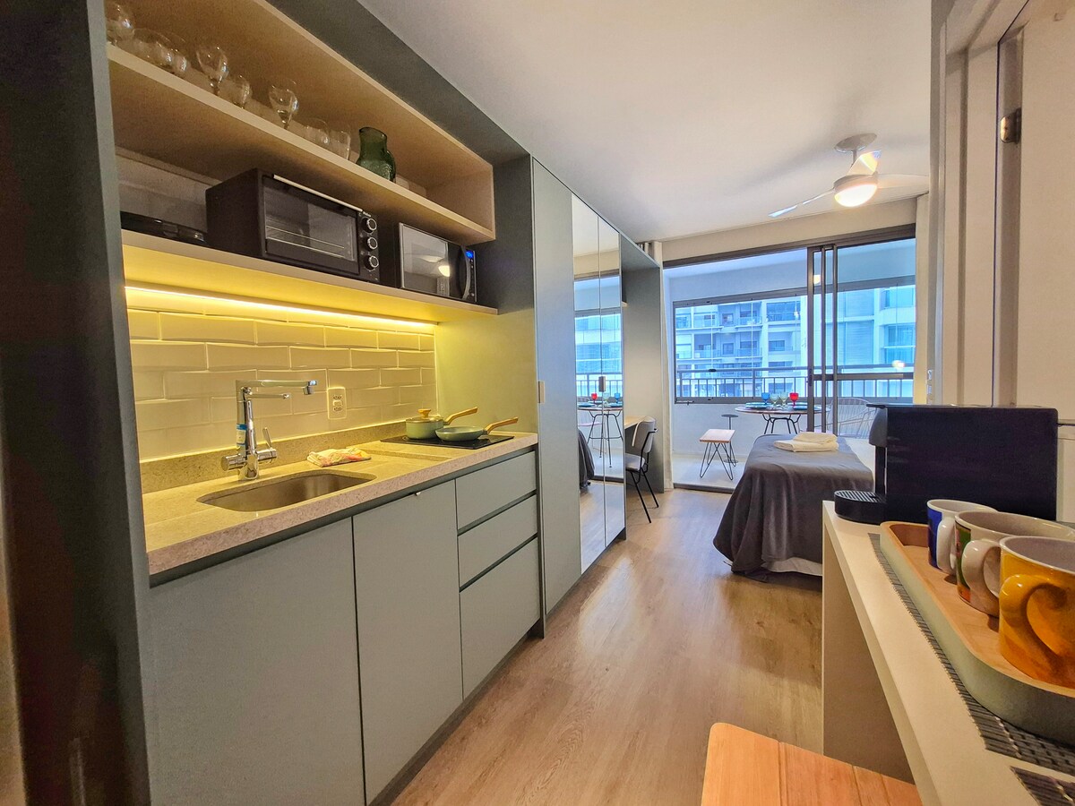 在這間舒適的28平方公尺單間公寓探索聖保羅,非常適合情侶、小家庭和商務差旅人士。 此空間距離Vila Madalena地鐵站僅15步之遙,提供: • 一張雙人床和一張雙人沙發床,最多可供4人舒適入住。 •設有微波爐、冰箱、爐台和基本餐具的小型廚房 • 浴室和毛巾遊戲 •空調 •高速WiFi •智慧電視 •泳池 •健身房 •洗衣房 共享工作空間