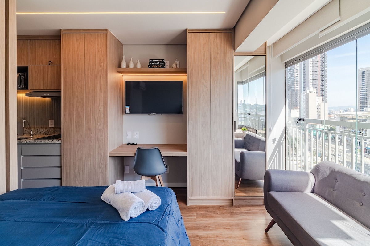 Estúdio espaçoso com muito design, arquitetura e a melhor vista de São Paulo. Loft completo! Com cama queen, closet, ar condicionado silencioso, cozinha completa, home office, WI-FI, TV 55” e uma belíssima banheira de imersão, de onde pode apreciar o seu drink preferido e curtir uma vista apaixonante. São Paulo toda estará há poucos minutos de você. Acesse o metrô andando apenas 200m. Reserve com tranquilidade! Proporcionaremos uma excelente hospedagem e uma ótima experiência!