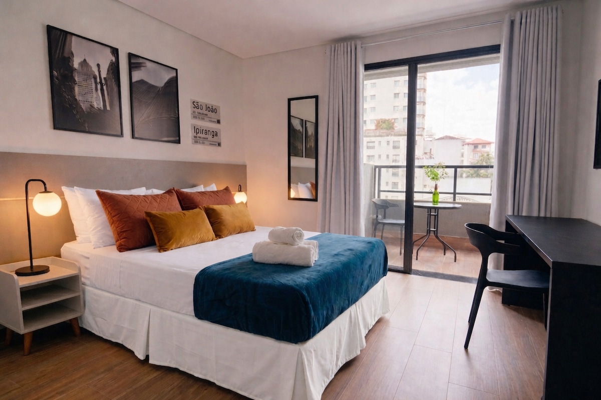 全新公寓,現代風格,高標準,地理位置優越,可欣賞安聯公園( Allianz Parque )的美景。 毗鄰商場、各種商店、交通工具、公園、旅遊景點和商業大樓。 單間公寓設備齊全,配有舒適的標準雙人牀、智慧電視和網路。 廚房配備所有餐具、爐台、冰箱和微波爐。有停車位(旋轉式)。 一切都近在咫尺,溫馨舒適,非常適合體驗美好時刻。