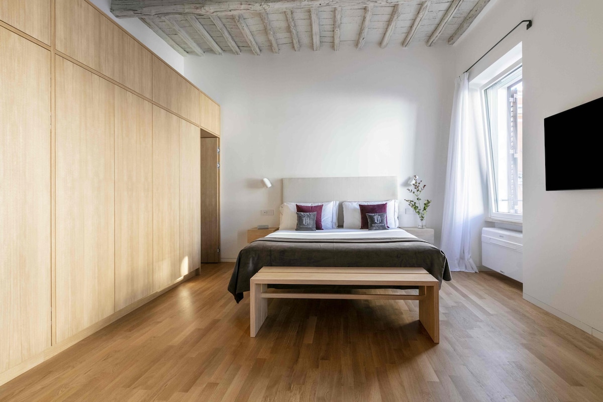 La Design Suite è un esclusivo appartamento nel cuore di Roma, combinato di design, comfort, funzionalità ed estetica, concepito dal talentuoso lavoro del designer milanese Giacomo Moor, nominato nel 2016 da Elle Decor Italia "best young designer". La parete in castagno che nasconde il confortevole angolo cottura, il grande guardaroba e la porta di accesso al bagno che avvolge con il suo guscio in travertino grezzo gli ospiti, sono solo alcune delle raffinatezze create su misura per voi.