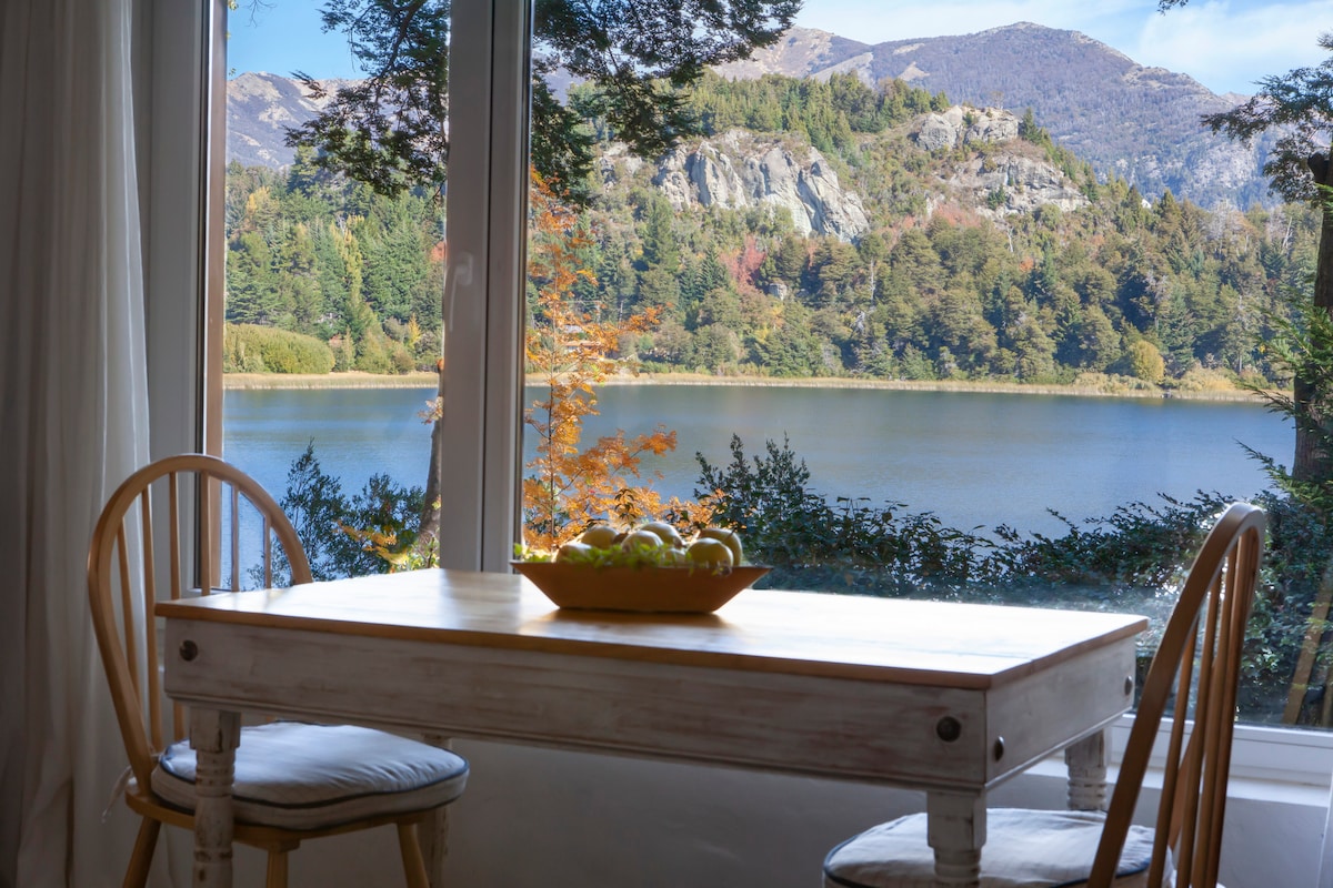 Cálida cabaña de estilo rústico a orillas del lago Nahuel Huapi con hidromasaje, hogar a leña, y deck. Monoambiente creado para el relax y el romanticismo con vista al amanecer y salida de la luna sobre el lago. Smart TV e internet por FIBRA OPTICA con wifi para trabajar. Una kitchinette con todo lo necesario, incluyendo cafetera dolce gusto. Caja de seguridad para resguardar tus notebooks al ir de paseo. Baño completo. Pool, ping-pong. Playa: Kayak y standup paddle. Desayuno continental.