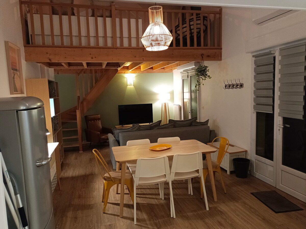 Appartement atypique de 44m2 à l'étage d'une maison dans une impasse très calme. Logement fonctionnel pour 4 personnes, pour les vacances ou pour affaires. Nous fournissons draps et serviettes. Grand salon très lumineux (grand volume, ouvertures est-ouest) et cuisine ouverte. Grande chambre avec plafond rampant et placard. Salle de bain avec toilette et douche 90x90. Buanderie pour plus de rangement. Un coin jardin privatif à votre disposition. Parking gratuit dans la rue.