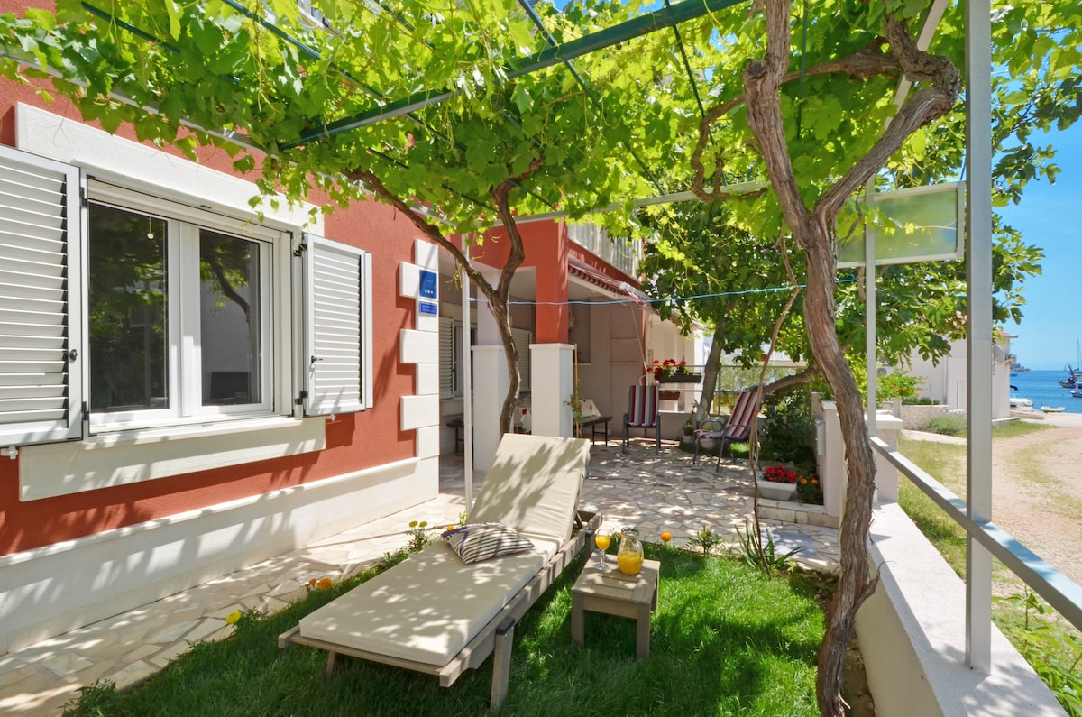 Our simple, cozy, small 2 bedroom holiday house is 30 m from the beach, secluded & isolated , in a beautiful and quiet location, near the town of Trogir (a Croatian hotspot). There is a huge terrace, next to a mediterranean garden with a BBQ (grill) to enjoy your free time. You have the whole place just for yourselves! You can not come to the house with your car! The parking is free public parking on the street around 35 m away from the house.
