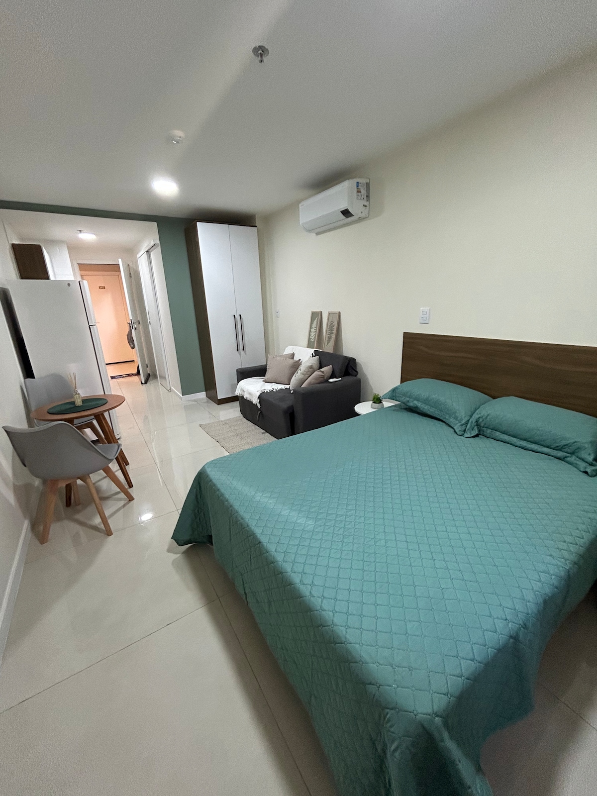 一個全新的單間公寓,位於安靜的街區,非常靠近Unimed醫院和南部最大的購物中心Park Sul。前往沃爾塔雷東達(Volta Redonda)的商業中心(Vila、Aterrado和Centro)最多需要10分鐘。 全新的床單、浴巾、餐具和用具。微波爐、空氣炸鍋、冰箱和空調,讓您舒適安心。 大樓有自助洗衣房,另收費。在街上很容易找到停車位。