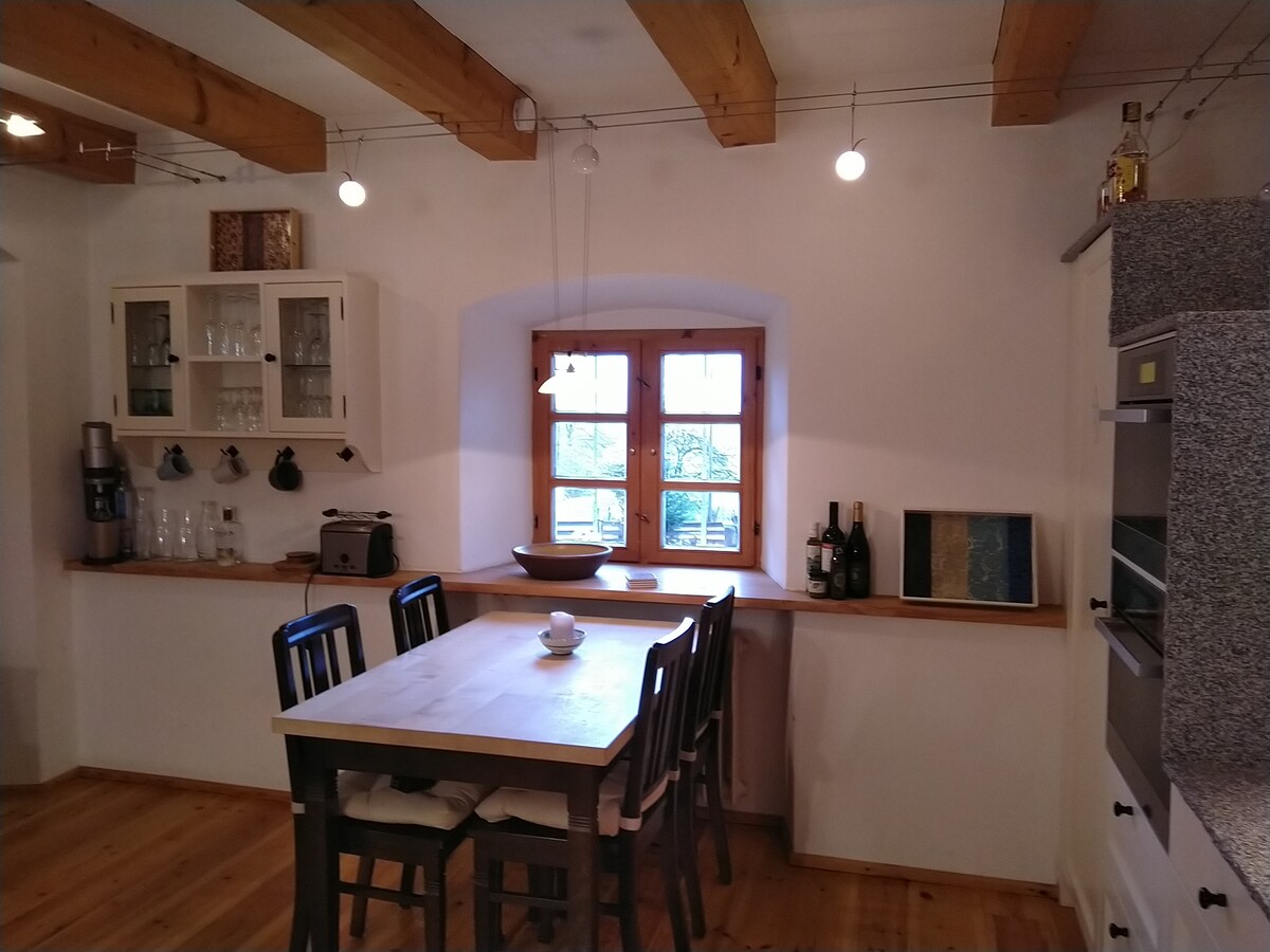 設備齊全的公寓,位於阿爾卑斯山和慕尼黑之間的田園地段,非常適合您的山區、湖泊或城市度假,無論是否有遠程工作。 這間現代、舒適、閣樓式4房公寓提供100平方公尺的空間,包括3間臥室、一間配有初級用品的廚房、2間浴室、一個帶露臺的寬敞花園、樹屋、彈跳床。 享受壁爐、高速網路、遠距工作桌。房客可使用漂亮的按摩浴缸和健身室。