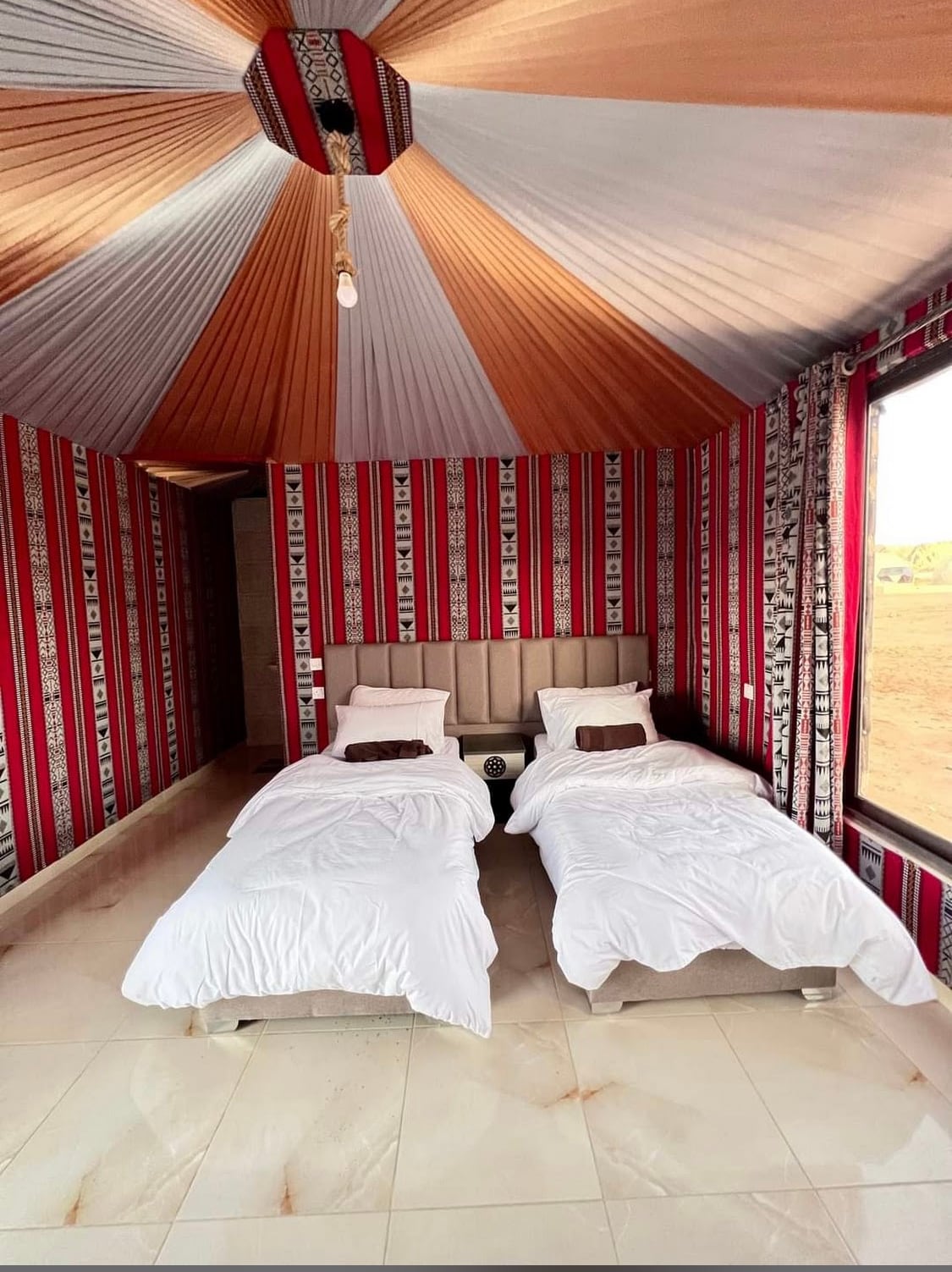 在瓦迪拉姆沙漠中心的豪華貝多因帳篷中過夜 這座豪華帳篷由3張單人牀組成,獨立房間配有浴室和全景窗戶,可通往私人露臺,可欣賞迷人的沙漠景觀。 我們將為您提供毛巾、洗髮精和免費水。 包括在公共房間的早餐。 如果您不預訂我們的導覽,村莊的接送費用為每人10日元。