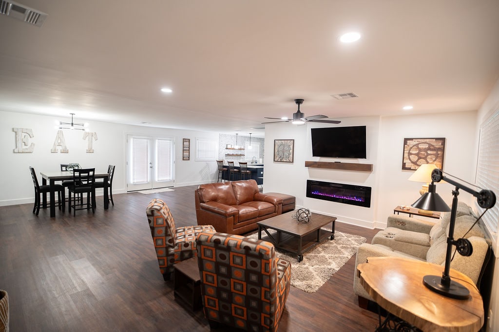 歡迎來到我們的農舍! 配備現代化室內設計的客製化房源,提供奢華和舒適的住宿體驗,適合兒童和寵物入住。 便利設備 -寵愛的房客設施 - 65吋索尼Bravia電視 - 6英尺浴缸 -埃及棉牀單 -紫色牀墊 -主廚廚房 -濃縮咖啡、倒咖啡、Keurig、滴漏咖啡 -室內壁爐 -閱讀角/兒童遊戲室 - Pack-n-play -高腳椅 -火坑 -露臺電視 -車庫 -龍捲風避難所 -安全的街區 -房客相機通道