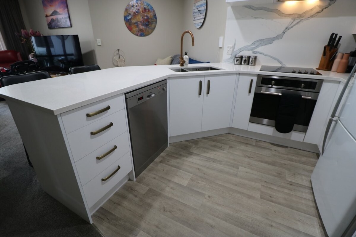 入住這間位處中心地段的公寓,全家到哪都方便。 一樓可直接使用泳池和水療池。巨大的戶外區域,有充足的空間。步行即可抵達紐西蘭最迷人的衝浪海灘之一。步行即可抵達市中心的Mt Maunganui村,您會發現一系列令人驚嘆的餐廳。Bay Oval在附近。 踏出房門即可抵達迷人的咖啡廳。 兩輛車的室內停車位。 電梯直達您的公寓。