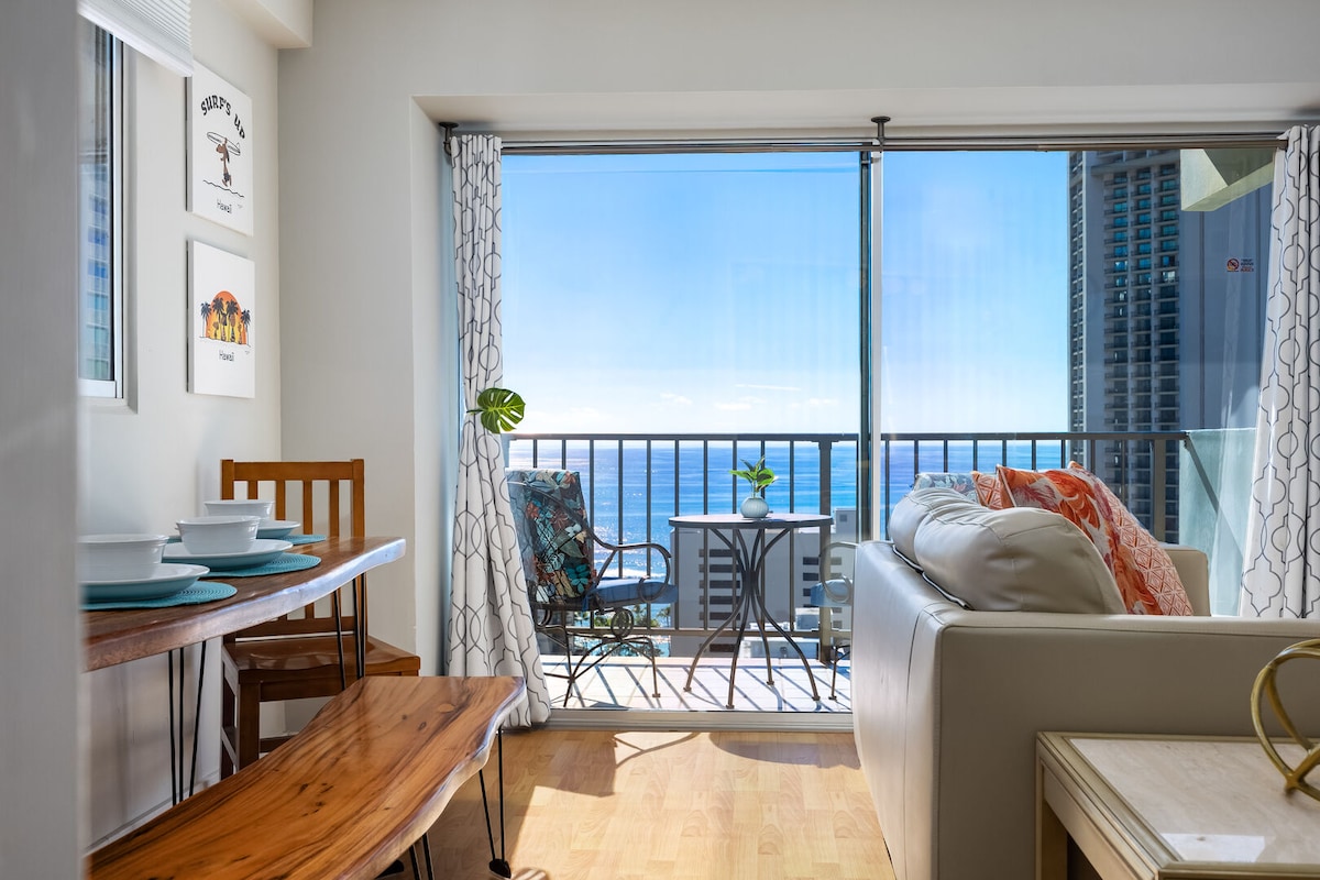 在威基基市中心高樓預訂,可欣賞海景,步行兩分鐘即可抵達主海灘和商店! 天堂正在呼喚!享用咖啡的同時,欣賞廣闊的部分海洋、山脈和城市景觀。 我們的私人通風單間公寓配有一張豪華的標準雙人牀、堅固的雙人沙發牀(推薦給5英尺9或以下的房客)、全套浴室和小廚房。 高速網路,可串流您最喜歡的電影或追蹤遠端工作生活。 在我們訂滿之前立即預訂!