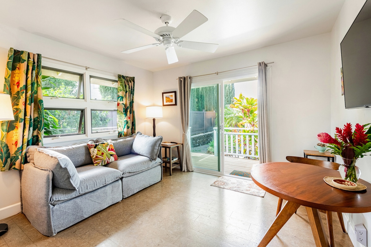 Aloha和E Komo Mai! (歡迎)我們的Tranquililty Ohana以復古熱帶風格精美裝飾,位於非常安靜的社區,為您提供私人舒適的空間,讓您放鬆身心。 窗戶座椅為閱讀提供了一個很好的角落。 醒來時聽著鳥兒的歌聲,在您自己的私人陽台上享用早晨的咖啡或茶,同時欣賞美麗的花園景觀。 請在島上最美麗的白色沙灘上使用我們的沙灘裝備,距離15分鐘路程。