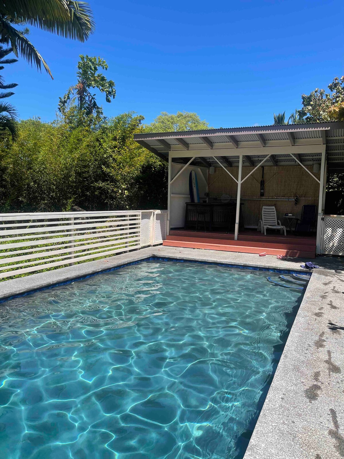 距夏威夷火山國家公園30分鐘路程! 10分鐘即可抵達Keaau 12分鐘到達Pahoa 尋找在夏威夷老城區度過輕鬆的s-l-o-w假期? 這裡有海景、清爽的私人泳池、小屋和新改造的明亮小屋,坐落在茂密的綠色叢林葉中,絕對是理想地點! 全年安全遊泳,距離黑沙灘、市場/餐廳不遠。 休息室,放鬆,在酒吧製作飲料,享受熱帶鳥鳴。 重複。完美、無壓力的假期。