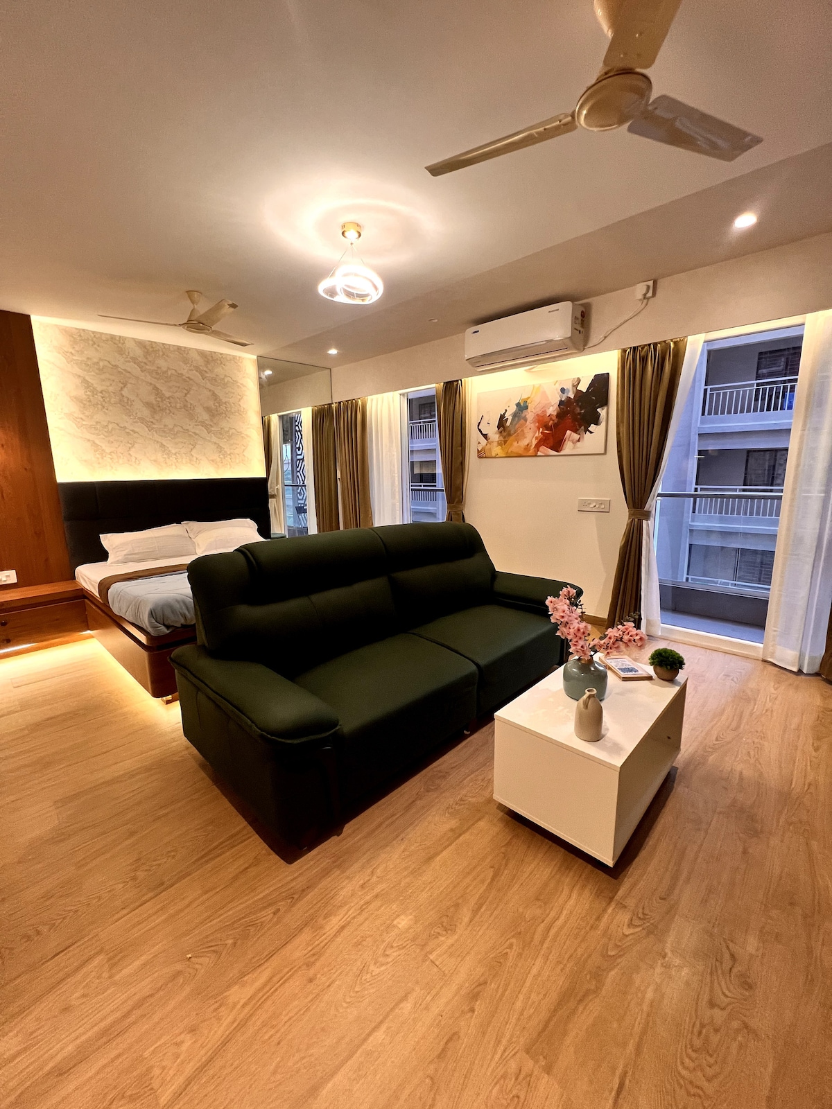 Stay in one of Pune’s most exclusive communities at this private studio. Welcome to Lodha Belmondo – Experience the Essence of Luxury, a serene and a perfect blend of comfort, convenience, and class. Overlooking the majestic Sahyadri mountains, the scenic Mumbai-Pune Expressway, and the iconic Gahunje Cricket Stadium, this tastefully designed home offers a romantic escape, a peaceful work-from-home retreat, or a weekend getaway near Mumbai and Pune.